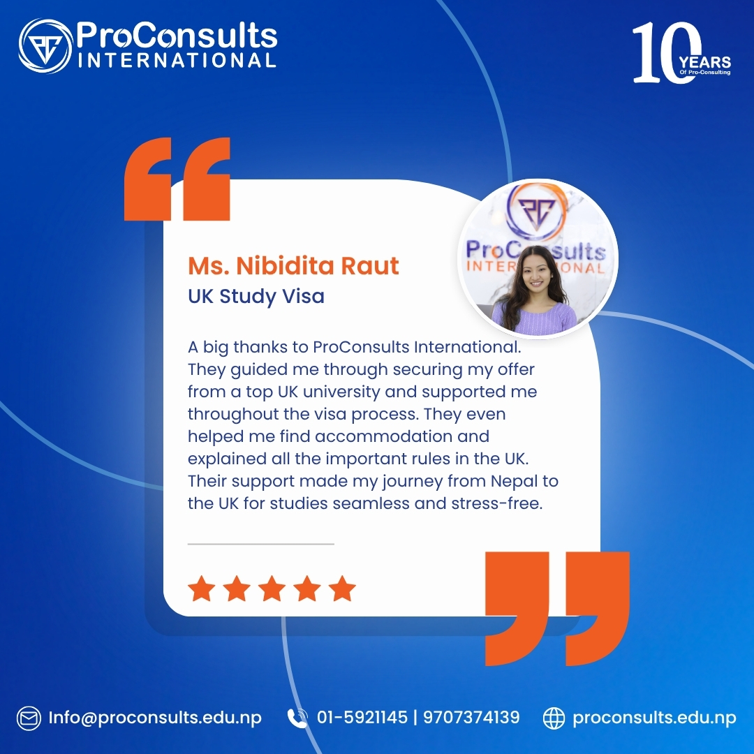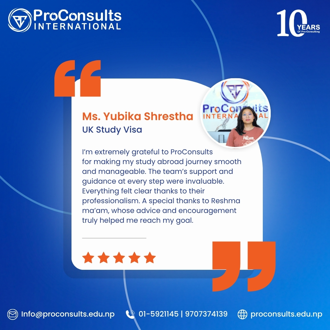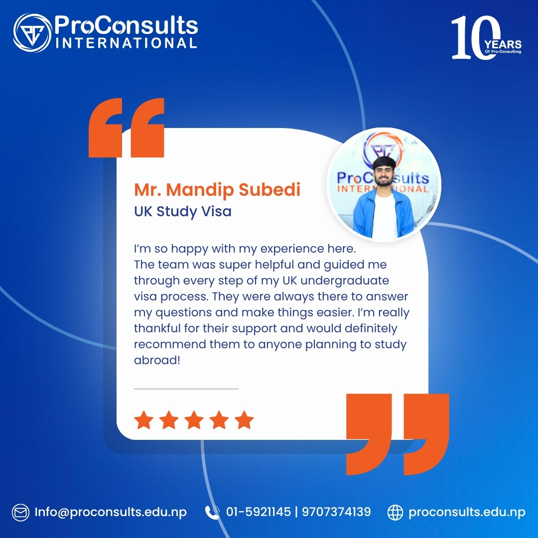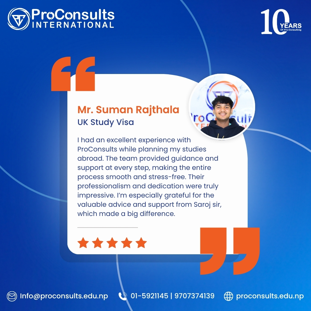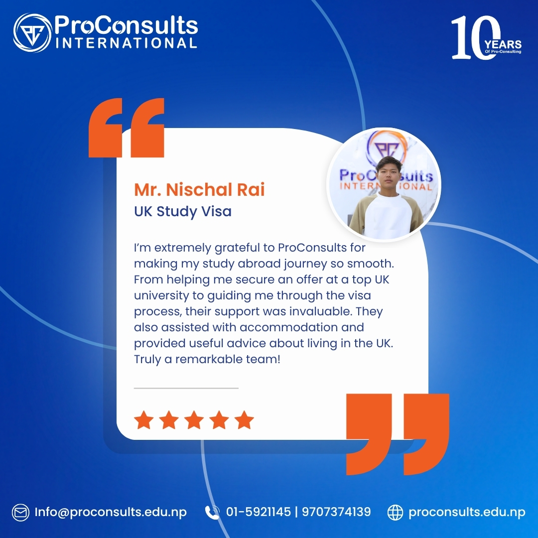 A big thanks to ProConsults International. They guided me through securing my offer from a top UK university and supported me throughout the visa process. They even helped me find accommodation and explained all the important rules in the UK. Their support made my journey from Nepal to the UK for studies seamless and stress-free.
