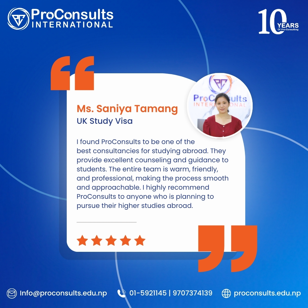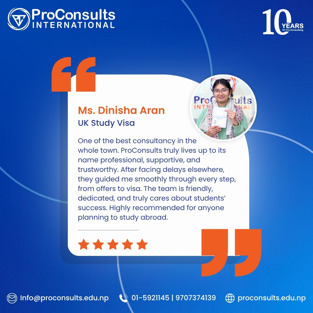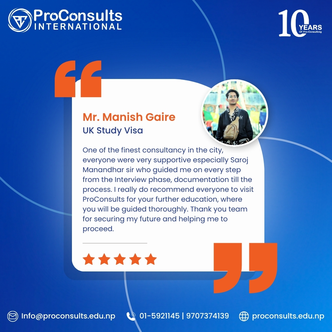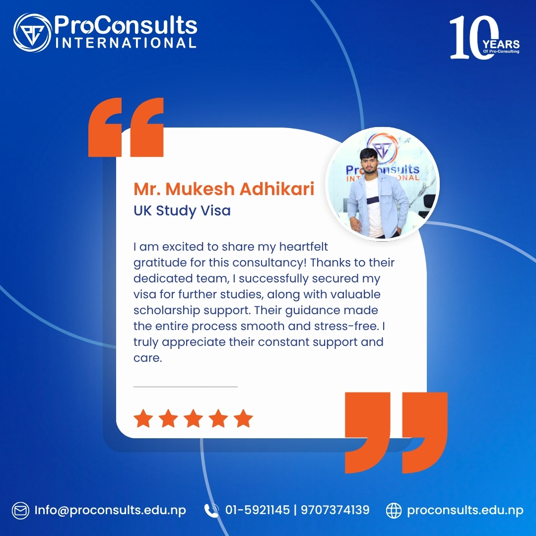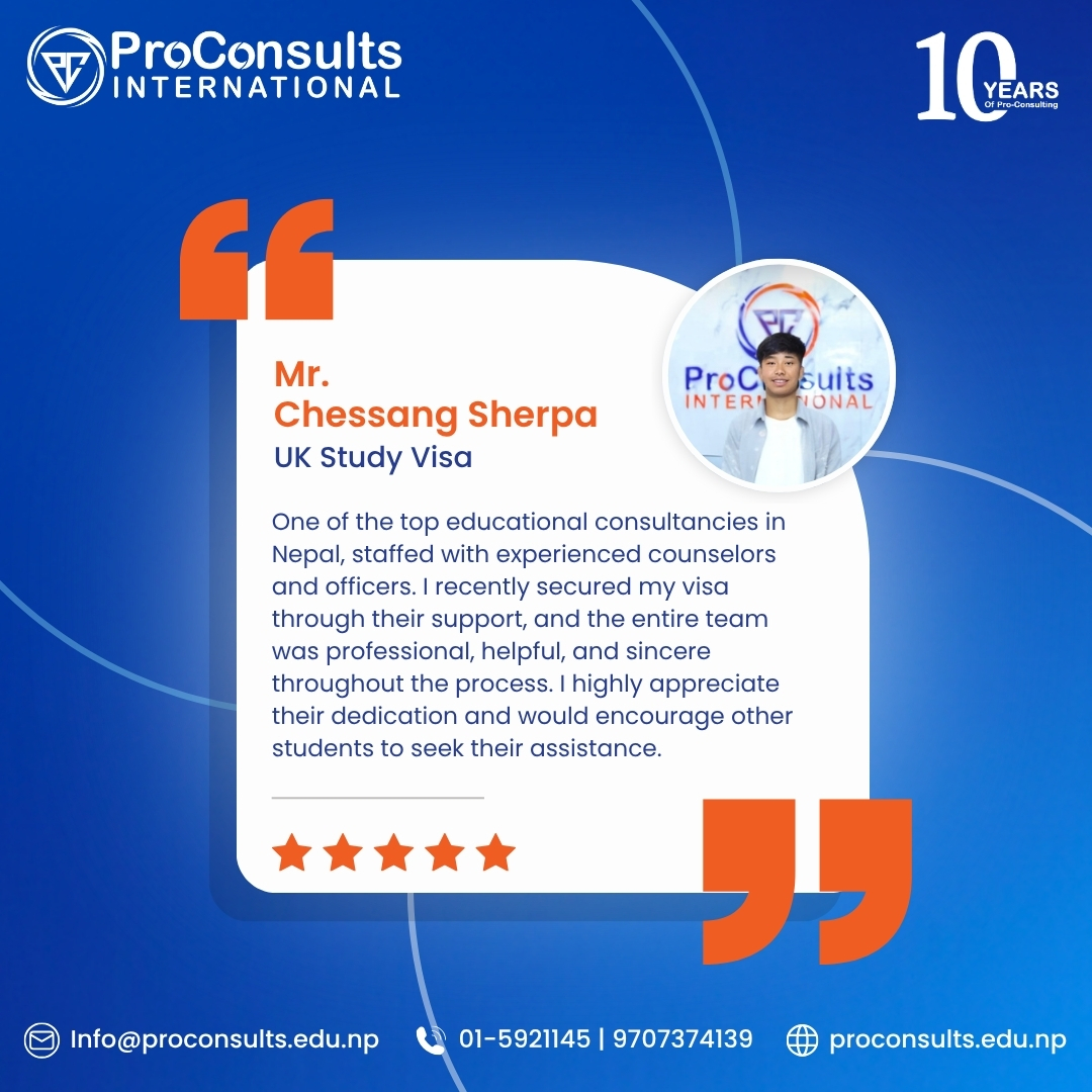 A big thanks to ProConsults International. They guided me through securing my offer from a top UK university and supported me throughout the visa process. They even helped me find accommodation and explained all the important rules in the UK. Their support made my journey from Nepal to the UK for studies seamless and stress-free.