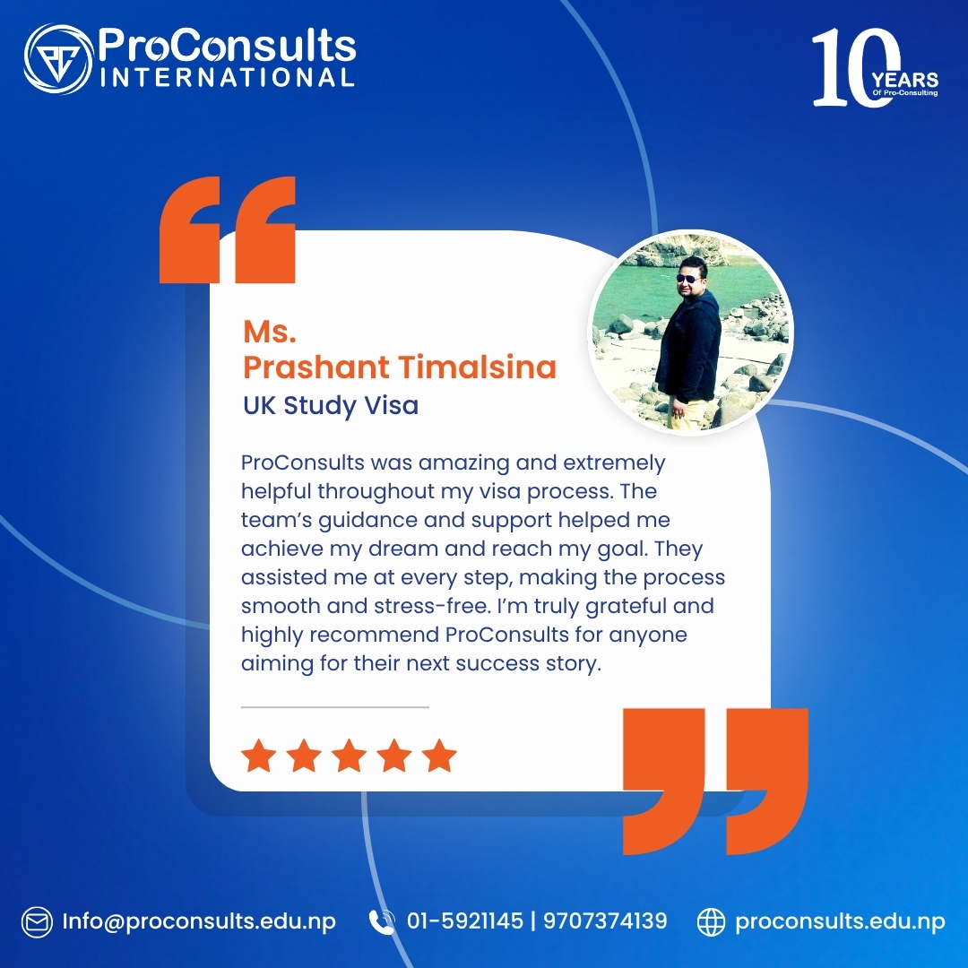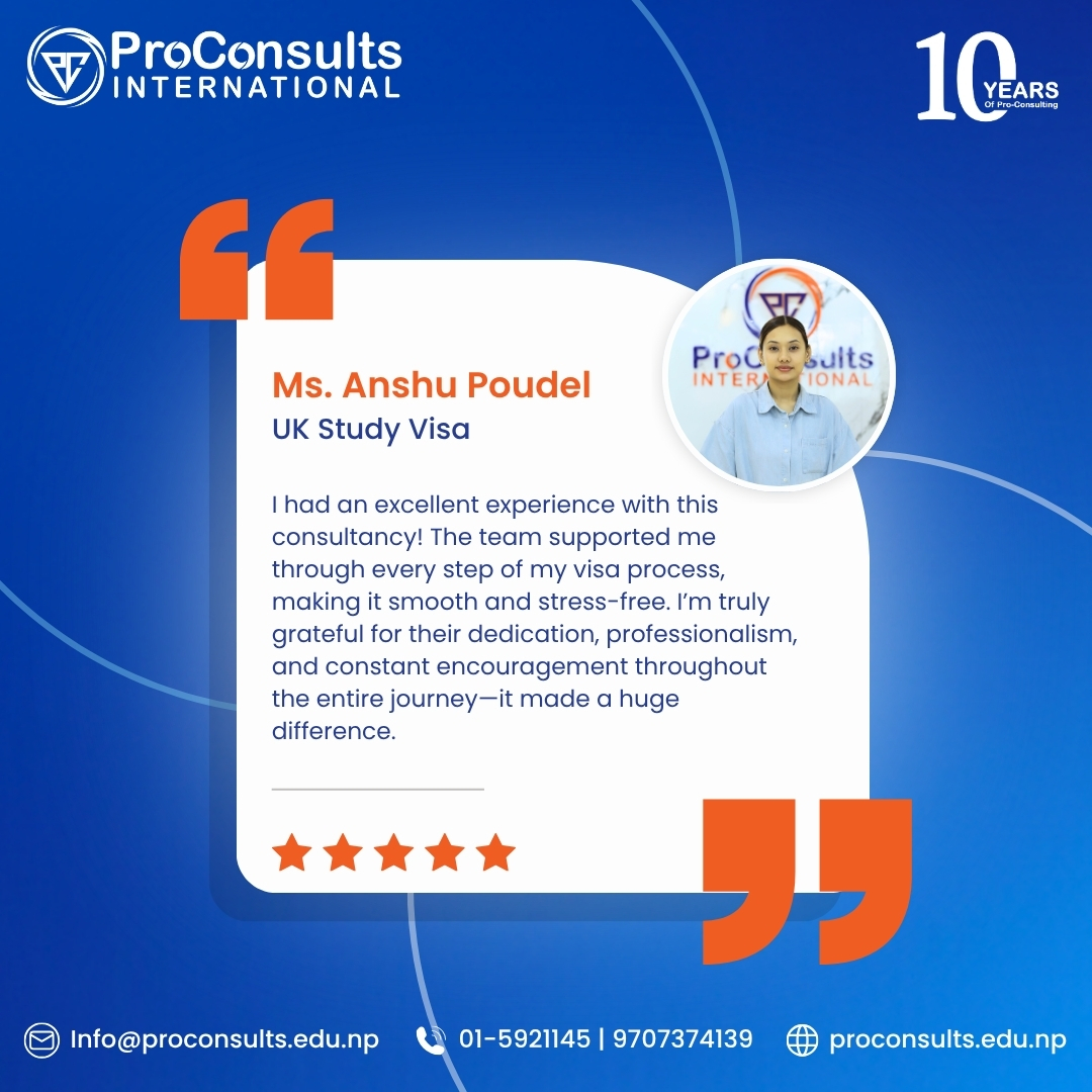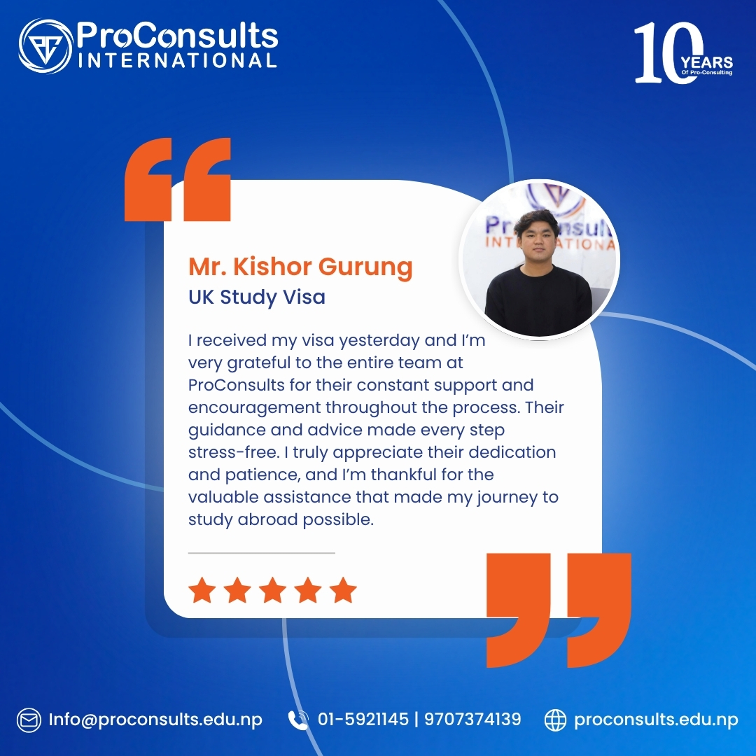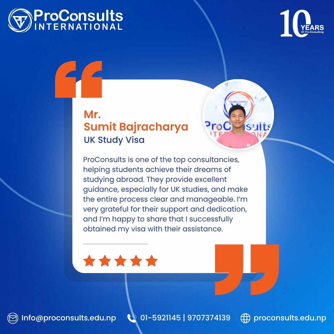 I am thrilled to share my experience with Proconsults International! I received my UK visa, thanks to their amazing support from counseling, interview, and test preparation to visa processing. Special thanks to Sagar Sir, Saroz Sir, and the team. Highly recommended for anyone planning to study abroad, they make your dreams achievable and seamless!