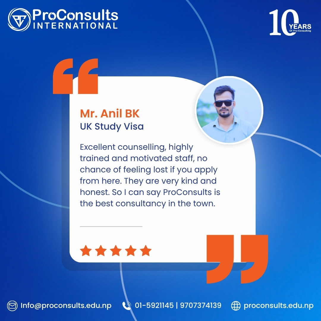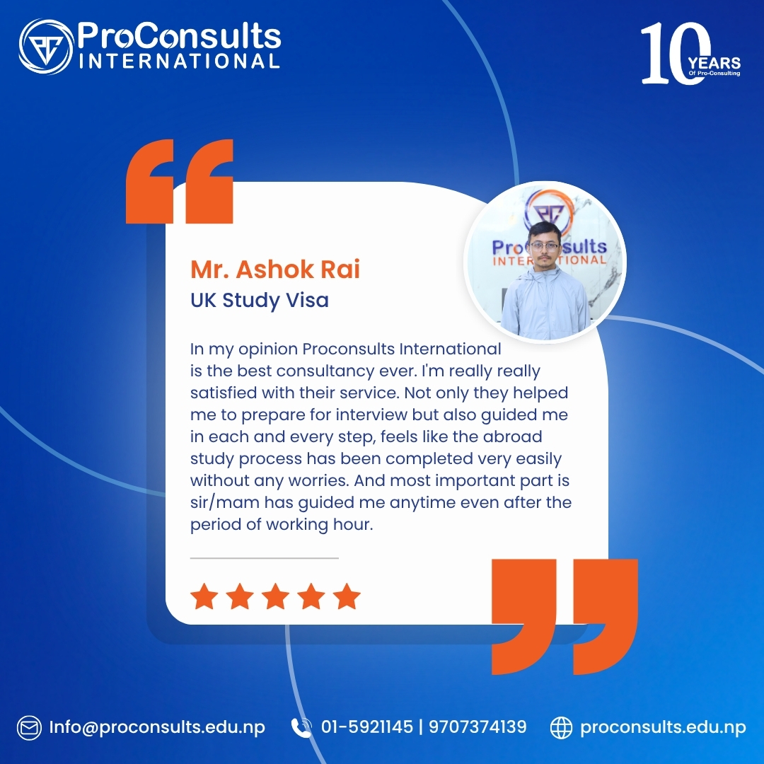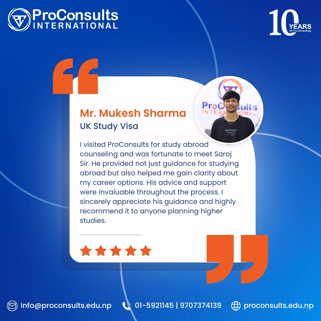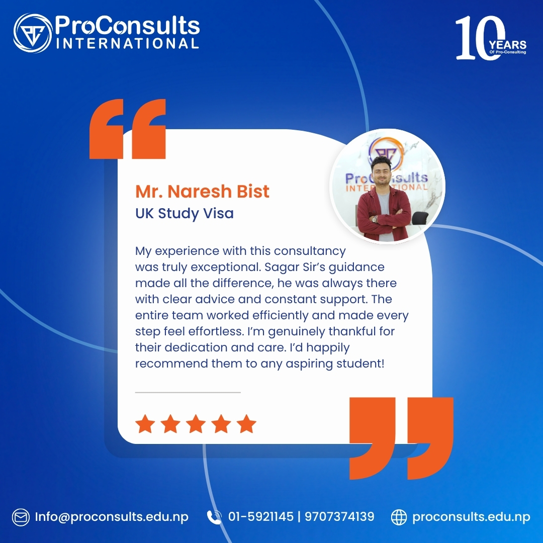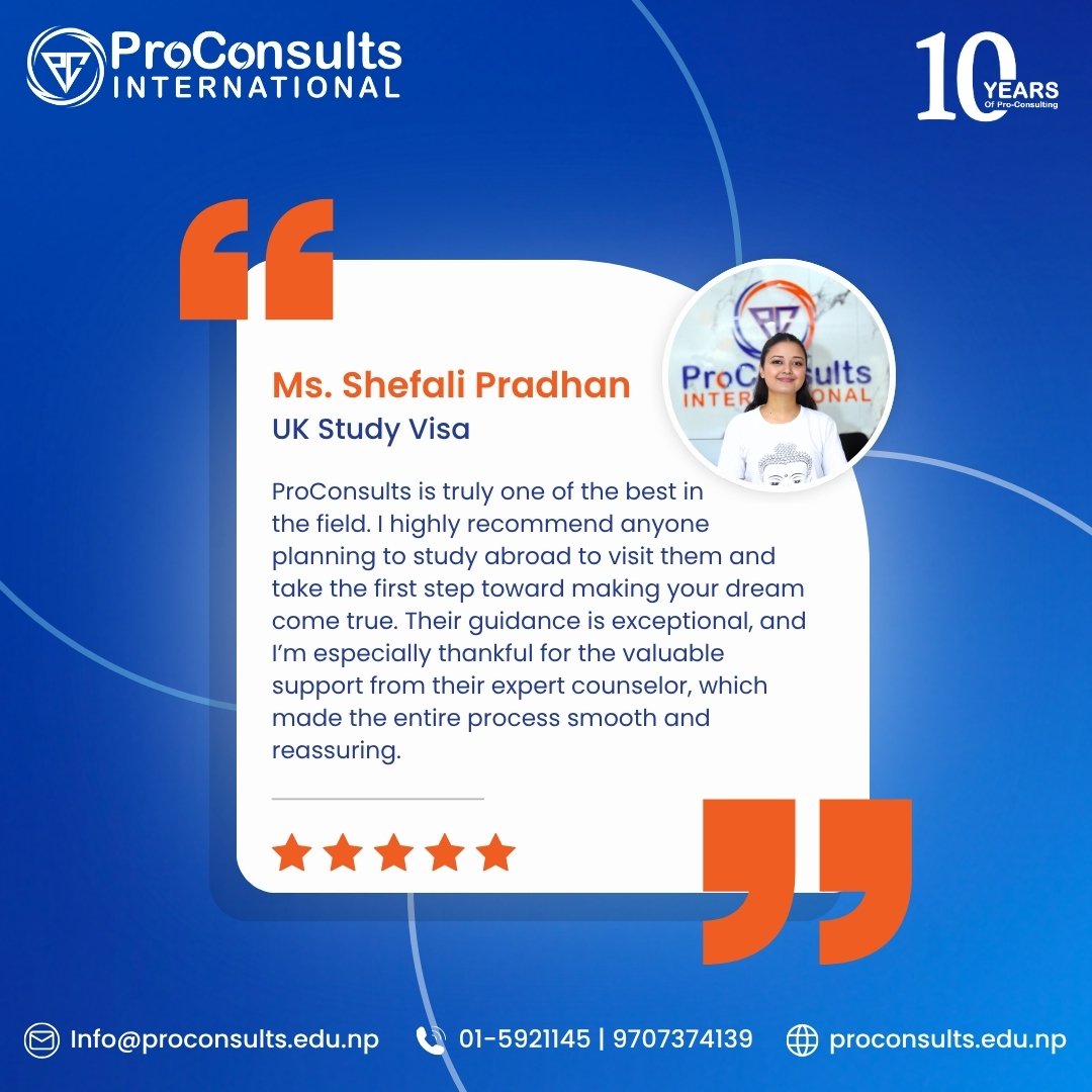 I am thrilled to share my experience with Proconsults International! I received my UK visa, thanks to their amazing support from counseling, interview, and test preparation to visa processing. Special thanks to Sagar Sir, Saroz Sir, and the team. Highly recommended for anyone planning to study abroad, they make your dreams achievable and seamless!