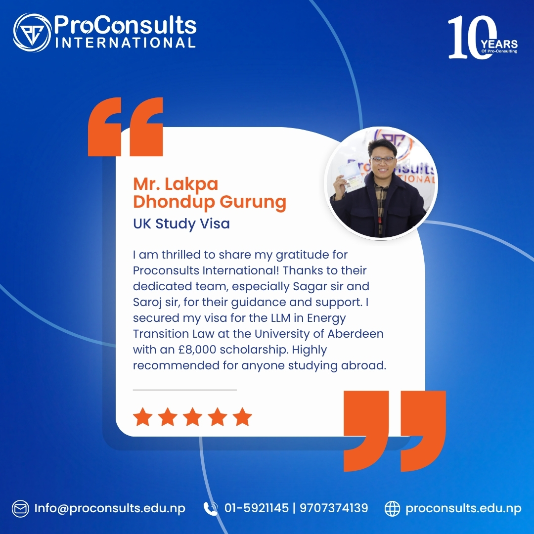I am thrilled to share my gratitude for Proconsults International! Thanks to their dedicated team, especially Sagar sir and Saroj sir, for their guidance and support. I secured my visa for the LLM in Energy Transition Law at the University of Aberdeen with an £8,000 scholarship. Highly recommended for anyone studying abroad.
