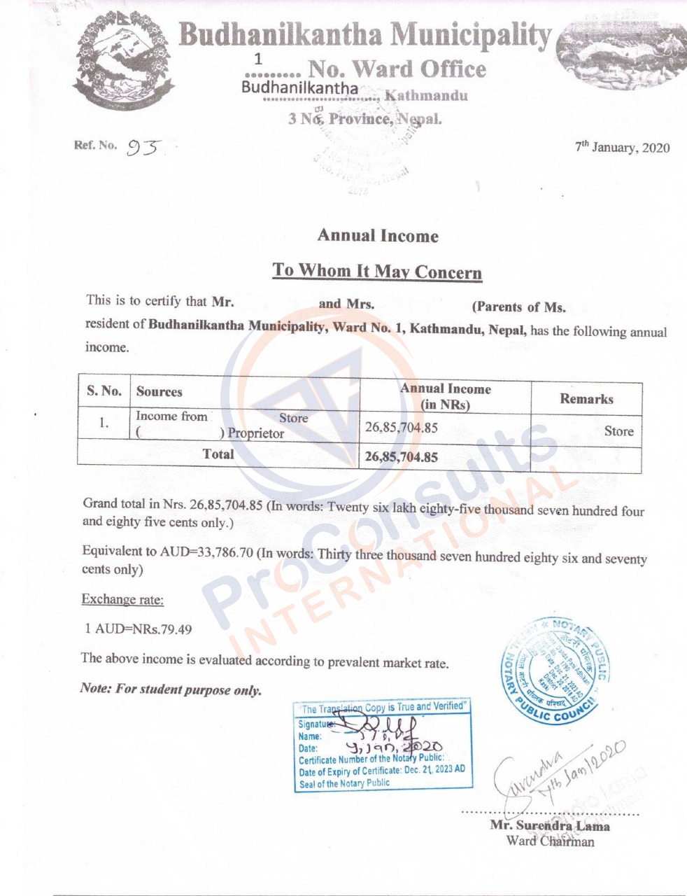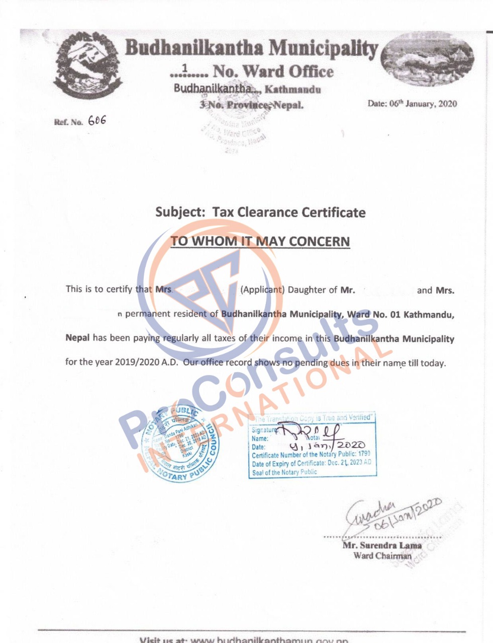The following documents issued by the local Ward Office in Nepal are required for Australia-related purposes to verify personal, residential, and financial information: Tax Clearance Certificate, Address Verification Certificate, Birth Verification Certificate, Relationship Verification Certificate, Recommendation Letter (including sponsor’s PAN verification), and Annual Income Verification Certificate. These documents support visa, scholarship, and other official applications.